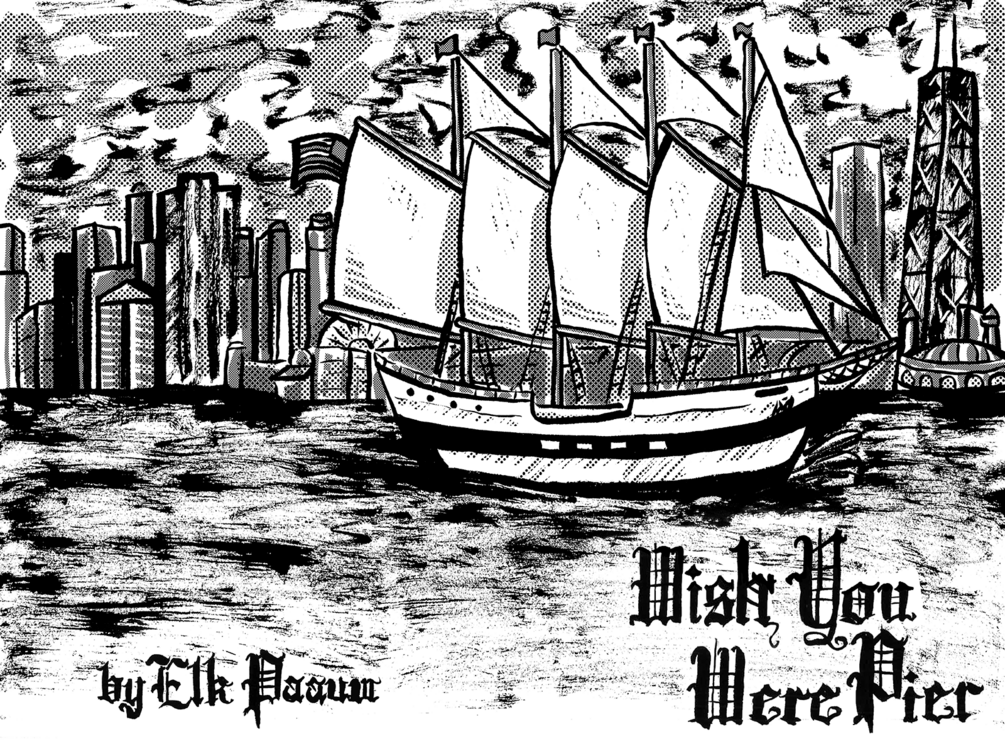 50 pages of black-and-white swash-buckling comics with monochromatic cyan covers.Also comes with an accompanying mix CD called "They Call the Wind Mariah", which can be streamed for free on YouTube at tinyurl.com/tallshipmixtape! Physical copies of "Wish You Were Pier" can be purchased at Quimby’s and Chicago Comics in Illinois, and at various locations up and down the West coast through Emerald Comics Distribution,and via mail on my Storenvy, elkpapa.storenvy.com. Please pay what you will here, it took me over 8 months to make this thing and I would appreciate the $$ if you can spare any! S:"D